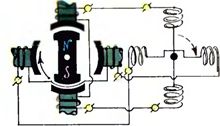 Рис. 5. Система двухфазного тока. В 1885 году итальянский профессор Галилео Феррарис развил теорию, по которой два переменных тока, сдвинутые по фазе на 90°, с помощью катушек, соответственно расположенных, создают постоянное по интенсивности вращающееся магнитное поле, которое можно использовать при создании электродвигателя переменного тока (рис. 5). Принцип легко понять с помощью модели, демонстрирующей сложение двух гармонических колебаний (рис. 6). Она состоит из пары пластин с одинаковыми, расположенными под прямым углом друг к другу прорезями, за ними — экран. Если поток света направлен на неподвижные пластины, то на экране он образует лишь одну световую точку. Когда же пластины начнут колебаться с одинаковой частотой, но со сдвигом фаз в 90°, световая точка будет описывать окружность.