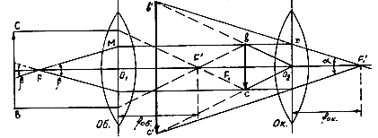 где: a - расстояние от оптического центра до предмета, Ход лучей в трубе Кеплера. Астрономическая труба Кеплера является простейшей зрительной трубой; она состоит из двух собирательных линз - объектива и окуляра, имеющих общую главную оптическую ось, и корпуса; объектив трубы Кеплера - длиннофокусный, а окуляр - короткофокусный. При этом изображение, даваемое объективом, должно располагаться между передним фокусом окуляра и его оптическим центром; Построим в трубе Кеплера изображение отрезка BC, то-есть, нарисуем ход лучей от точек B и C, используя два из трех перечисленных выше лучей (рис.3.7).