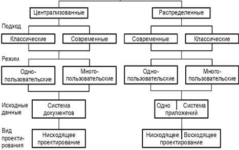 Подходы к проектированиюВ конце 70-х годов появились современные СУБД, обеспечивающие физическую и логическую независимость, безопасность данных, обладающие развитыми языками БД. Последнее десятилетие характеризуется появлением распределенных и объектно-ориентированных баз данных, характеристики которых определяются приложениями средств автоматизации проектирования и интеллектуализации БД (рис. 3.1). Существует два подхода к построению БД, базирующихся на двух подходах к созданию автоматизированной системы управления (АСУ). Первый из них, широко использовавшийся в 80-е годы и потому получивший название классического (традиционного), связан с автоматизацией документооборота (совокупность документов, движущихся в процессе работы предприятия). Исходными и выходными координатами являлись документы.