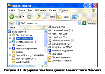 Иерархические базы данных — самая ранняя модель представления сложной структуры данных. Информация в иерархической базе организована по принципу древовидной структуры, в виде отношений «предок-потомок». Каждая запись может иметь не более одной родительской записи и несколько подчиненных. Связи записей реализуются в виде физических указателей с одной записи на другую. Основной недостаток иерархической структуры базы данных — невозможность реализовать отношения «много-ко-многим», а также ситуации, когда запись имеет несколько предков. Иерархические базы данных. Иерархические базы данных графически могут быть представлены как перевернутое дерево, состоящее из объектов различных уровней. Верхний уровень (корень дерева) занимает один объект, второй - объекты второго уровня и так далее. Между объектами существуют связи, каждый объект может включать в себя несколько объектов более низкого уровня. Такие объекты находятся в отношении предка (объект, более близкий к корню) к потомку (объект более низкого уровня), при этом объект-предок может не иметь потомков или иметь их несколько, тогда как объект-потомок обязательно имеет только одного предка. Объекты, имеющие общего предка, называются близнецами. Иерархической базой данных является Каталог папок Windows, с которым можно работать, запустив Проводник. Верхний уровень занимает папка Рабочий стол. На втором уровне находятся папки Мой компьютер, Мои документы, Сетевое окружение и Корзина, которые являются потомками папки Рабочий стол, а между собой является близнецами. В свою очередь, папка Мой компьютер является предком по отношению к папкам третьего уровня -папкам дисков (Диск 3,5(А:), (С:), (D:), (Е:), (F:)) и системным папкам (сканер, bluetooth и.т.д.) - рис. 4.1. Организация данных в СУБД иерархического типа определяется в терминах: элемент, агрегат, запись (группа), групповое отношение, база данных. · · Запись - именованная совокупность атрибутов. Использование записей позволяет за одно обращение к базе получить некоторую логически связанную совокупность данных. Именно записи изменяются, добавляются и удаляются. Тип записи определяется составом ее атрибутов. Экземпляр записи - конкретная запись с конкретным значением элементов · Групповое отношение - иерархическое отношение между записями двух типов. Родительская запись (владелец группового отношения) называется исходной записью, а дочерние записи (члены группового отношения) - подчиненными. Иерархическая база данных может хранить только такие древовидные структуры. Корневая запись каждого дерева обязательно должна содержать ключ с уникальным значением. Ключи некорневых записей должны иметь уникальное значение только в рамках группового отношения. Каждая запись идентифицируется полным сцепленным ключом, под которым понимается совокупность ключей всех записей от корневой по иерархическому пути. При графическом изображении групповые отношения изображают дугами ориентированного графа, а типы записей - вершинами (диаграмма Бахмана). Для групповых отношений в иерархической модели обеспечивается автоматический режим включения и фиксированное членство. Это означает, что для запоминания любой некорневой записи в БД должна существовать ее родительская запись. Пример: Рассмотрим следующую модель данных предприятия (см. рис.4.2): предпр