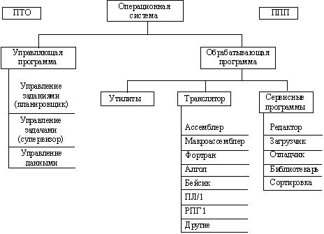 Программное обеспечение ЭВМ представляет собой комплекс программных средств, включающих Операционную систему (ОС), программы технического обслуживания (ПТО) и пакеты прикладных программ (ППП). Структура программного обеспечения представлена на рисунке: