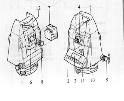 Рис. 8. ТС600 1– установочный винт, 2 –клавиатура, 3 – дисплей,4 – фокусировка, 5 – ручка для переноски, 6 – выход TDM, 7– батарея, 8 – винт вертикального управления, 9 – винт горизонтального управления, 10 – интерфейс RS-232, 11 – круговой уровень, 12 – оптический прицел.
