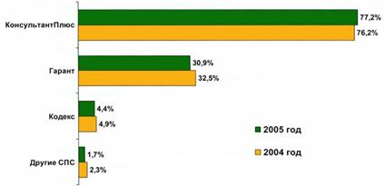 Рис. 2.4 Динамика долей рынка [20] различных СПС По данным исследования РОМИР-мониторинг, проведенного в 2005 году среди пользователей СПС в России, более 77% назвали "КонсультантПлюс" основной системой в своей компании. Вторая по предпочтениям — СПС "Гарант". Тех, кто сделал выбор в ее пользу, привлекают специальные возможности этой системы. Заметим, что по данным уже упоминавшегося исследования КОМКОН "Гарант" считают основной системой в компании более 30% пользователей СПС. Одновременно эти системы стоят на компьютерах всего у 14% российских пользователей СПС. В их числе некоторые региональные Управления ФНС России и налоговые инспекции (см. врезки "СПС в работе налоговых органов"). Иногда устанавливается и большее число СПС. Это характерно для государственных органов, занимающихся законотворчеством, и крупнейших частных компаний. По критерию распространенности безусловным лидером среди СПС является "КонсультантПлюс". По данным разработчиков, эту систему используют в работе более 180 000 предприятий и организаций. "Гарант" — вторая по распространенности система — у компании 85 000 корпоративных клиентов (данные компании "Гарант"). Это положение компаний на рынке подтверждается и результатами независимых исследований, проведенных компанией КОМКОН и рядом других исследователей.