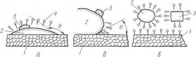 На предприятиях меховой и овчинно-шубной промышленности применяются следующие методы обезжиривания: эмульсионный и органическими растворителями. Эмульсионный метод обезжиривания. Этот метод обезжиривания получил наибольшее распространение. Он основан на использовании моющей способности поверхностно-активных веществ, к которым предъявляются следующие требования: они не должны отрицательно влиять на изменение свойств волосяного покрова и кожевой ткани; должны обладать моющей способностью в жесткой воде, т. е. в такой воде, где содержатся в большом количестве соли магния и кальция; обладать хорошей растворимостью в воде при комнатной температуре. Моющая способность поверхностно-активных веществ зависит от строения молекул. На рис. 13 изображена схема удаления загрязнений с волосяного покрова шкур. Частицы жира и загрязнений плотно покрывают волос (рис. 13, а). Моющее вещество ослабляет силы сцепления между частицами загрязнений и волосом (рис. 13, б), в результате чего происходит постепенное обводнение поверхности загрязнения или жира пленкой моющего вещества. Таким образом, моющее вещество, обладая высокой смачивающей способностью, оказывает расклинивающее воздействие, и частицы жира и загрязнений отрываются от поверхности волоса (рис. 13, в).
