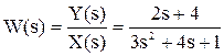 Передаточные функции. Преобразование ДУ по Лапласу дает возможность ввести удобное понятие передаточной функции, характеризующей динамические свойства системы. Например, операторное уравнение 3s2Y(s) + 4sY(s) + Y(s) = 2sX(s) + 4X(s) можно преобразовать, вынеся X(s) и Y(s) за скобки и поделив друг на друга: Y(s)*(3s2 + 4s + 1) = X(s)*(2s + 4)