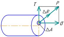 Когда говорят о напряжениях, то имеют в виду напряжение в точке сечения. Учитывая принятое в сопротивлении материалов допущение, что материал детали однороден и изотропен, получаем, что напряжения в каждой точке сечения одинаковы. Следовательно, приведенное выше Рис. 1.3 определение напряжения справедливо. Обратимся к рис.1.3. В сечении стержня выделена маленькая площадка ∆A, на которой действует внутренняя сила ∆R. Тогда среднее напряжение на площадке равно Рср = ∆R/∆A. Уменьшая размеры площадки до уровня точки, получим Р = lim ∆R/∆A = dR/dA – напряжение в точке сечения. ∆A→0 Полное напряжение Р можно разложить на две составляющие: 1)составляющую, нормальную к плоскости сечения σ - нормальное напряжение; 2)составляющую, лежащую в плоскости сечения τ - касательное или тангенциальное напряжение. Размерность напряжений. Напряжения измеряются в МПа. 1МПа= 1МПа=1Н/мм² Очевидно, что реальные (расчетные) напряжения в конструкции не могут расти до бесконечности, они должны быть ограничены.