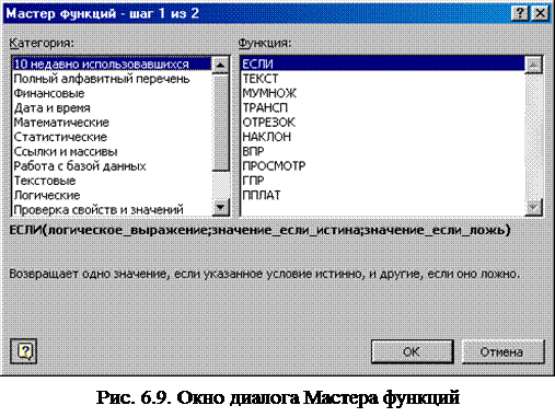 Для поиска нужной функции выберите в списке “Категории” категорию функции, а в правом – соответствующую функцию. Если неизвестно, к какой категории относится функция, то выберите “Полный алфавитный перечень” и найдите в нем требуемую функцию. Выбранная функция попадает в список “10 недавно использовавшихся”. Поэтому при последующем обращении к выбранной функции, ее можно будет найти в этом списке. Некоторые функции приведены в табл.6.1. С другими функциями можно познакомиться по технической документации или по справочной системе Excel. В качестве примера использования мастера функций рассмотрим порядок ввода функции ЕСЛИ согласно выражений (6.2), (6.4): · Выделите ячейку G6, в которую надо поместить выражение. Введите команду Вставка функция или щелкните по одноименной кнопке fx на панели инструментов стандартная откроется окно диалога Мастер функций (рис. 6.9). · Найдите в правом списке функцию ЕСЛИ, выделите ее и щелкните по кнопке ОК – откроется окно диалога для ввода формул (рис. 6.10). В окне диалога имеется три строки ввода, в соответствии с синтаксисом функции. При выделении любой строки в нижней части таблицы выводится подсказка о назначении данной строки. Первая строка служит для ввода логического условия, вторая – для ввода выражения соответствующего истине, и третья строка – для ввода выражения, соответствующего отрицательному результату сравнения (ложь). ·
