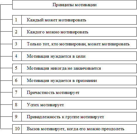 Основной особенностью управления персоналом при переходе к рынку является возрастающая роль личности работника. В управлении персоналом мотивация рассматривается как процесс активизации мотивов работников (внутренняя мотивация) и создания стимулов (внешняя мотивация) для их побуждения к эффективному труду. Мотивация как функция управления реализуется через систему стимулов, т.е. любые действия подчиненного должны иметь для него положительные или отрицательные последствия с точки зрения удовлетворения его потребностей или достижения его целей. Мотивация и стимулирование как методы управления трудом противоположны по направленности: первая направлена на изменение существующего положения; второе — на его закрепление, но при этом они взаимно дополняют друг друга: мы не сможем выбраться из кризиса без качественного изменения трудовой мотивации. Петер Ройш сформулировал десять основополагающих принципов мотивации (рис. 7.).