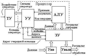 Обрабатываемые данные предварительно через устройство ввода Увв поступают на запоминающее устройство ЗУ, где сохраняются на всё время обработки. В этом же ЗУ хранится и программа обработки поступающей информации. Программа работы системы так же, как и «данные», хранятся в запоминающем устройстве в виде многоразрядных двоичных чисел, записанных в ячейки ЗУ по определённым адресам (адресам ячеек памяти). Двоичные числа, совокупность которых отображает программу обработки данных, структурированы на определённое число частей, каждая из которых имеет определённое назначение. В простейшем случае имеются следующие части: 1) код операции, которую надо выполнить с двумя двоичными числами, отображающими значения «данных» и называемыми «операндами»; 2) адрес первого операнда; 3) адрес второго операнда. Совокупность этих частей образует «команду». Работа ЭВМ заключается в последовательном выполнении команд, заданных программой. Координирует работу всех блоков во времени и управляет ими управляющее устройство УУ. А непосредственно логические и арифметические операции (действия) над операндами выполняет арифметико-логическое устройство АЛУ, которое по сигналу от УУ «код операции» каждый раз настраивается на выполнение конкретной операции. Устройство управления расшифровывает поступившую от ЗУ команду (рис.3 «очередная команда»), код операции направляет на АЛУ и оно готовится к выполнению соответствующей операции. Затем формирует сигналы выборки из ЗУ операндов (см. сигнал «Адреса данных») и определяет адрес очередной команды, которую следует выполнить на следующем такте работы ЭВМ («Адрес очередной команды»). По сигналам от УУ из ЗУ считываются операнды, и АЛУ выполняет необходимые действия. При этом образуется промежуточный результат («Результат операции»), который также сохраняет ЗУ. В зависимости от результата выполнения операции может появиться необходимость изменения последовательности выполнения команд, либо прекратить обработку данных, либо вывести оператору сообщения об ошибках. Для этой цели с АЛУ на УУ поступает сигнал «Признак результата». Процесс обработки введённых данных (информации) продолжается до тех пор, пока не будет извлечена команда «Конец вычислений», либо оператор по своему усмотрению не остановит процесс обработки данных. Полученный результат обработки также хранится в ЗУ и может быть выведен через устройство вывода Увыв по окончании процесса обработки либо в ходе процесса, если это предусмотрено программой. Для «общения» оператора с ЭВМ предусматриваются терминальные устройства ТУ, предназначенные для ввода оператором команд и других сообщений и для вывода оператору «сообщений» со стороны ЭВМ. На рис.3 не показаны связи управляющего устройства, обеспечивающие синхронизацию работы всех составных частей ЭВМ. Широкими стрелками отображается возможность параллельной передачи данных (одновременной передачи всех разрядов многоразрядных двоичных чисел). Практически все показанные на рис.3 блоки (кроме терминальных устройств) могут быть полностью выполнены только на цифровых интегральных микросхемах (ИМС). В частности, УУ, АЛУ и часть ЗУ (регистровая память - СОЗУ) могут быть выполнены в виде одной ИМС большой степени интеграции. Названная совокупность блоков образует микропроцессор - цент