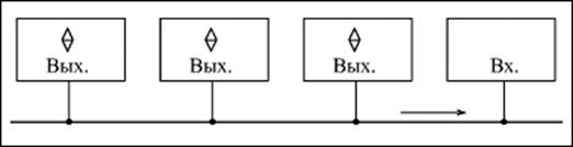 Двунаправленная линия обязательно является мультиплексированной, а мультиплексированная линия может быть как однонаправленной, так и двунаправленной. Но в любом случае к ней присоединяется несколько выходов, только один из которых в каждый момент времени находится в активном состоянии. Остальные выходы в это время отключаются (переводятся в пассивное состояние). В отличие от двунаправленной линии, к мультиплексированной линии, построенной на основе буферов, может быть подключен всего лишь один вход, но обязательно несколько выходов с ОК или 3С (рис. 3.7).