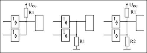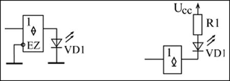 Иногда к выходам 3С резисторы не присоединяют вообще, но в этом случае надо обеспечить, чтобы последующий вход воспринимал сигнал с выхода 3С только тогда, когда выход находится в активном состоянии. Светодиоды могут подключаться к выходу буферов двумя основными способами (рис. 3.11). При первом из них (слева на рисунке) светодиод горит, когда на выходе 3С или 2С-сигнал логической единицы, а при втором (справа на рисунке) — когда на выходе ОК сигнал логического нуля.
