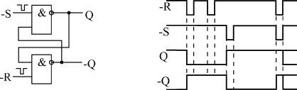 Триггеры В основе любого триггера (англ. — "тrigger" или "flip-flop") лежит схема из двух логических элементов, которые охвачены положительными обратными связями (то есть сигналы с выходов подаются на входы). В результате подобного включения схема может находиться в одном из двух устойчивых состояний, причем находиться сколь угодно долго, пока на нее подано напряжение питания. Пример такой схемы (так называемой триггерной ячейки) на двух двухвходовых элементах И-НЕ представлен на рис. 7.1. У схемы есть два инверсных входа: –R — сброс (от английского Reset), и –S — установка (от английского Set), а также два выхода: прямой выход Q и инверсный выход –Q.