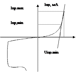 Полупроводниковым диодом называется ПП прибор с одним p-n переходом и двумя выводами. Рабочим элементом диода является p-n переход, а следовательно все параметры, свойственные p-n переходу и его ВАХ, являются параметрами и ВАХ ПП диода. В ПП диодах используются несимметричный p-n переход плоскостной или точечный в прямом или обратном включениях. В соответствии с конструкцией p-n перехода наиболее широкое применение получили точечные и плоскостные ПП диоды. Этот диод предназначен для преобразования переменного тока в постоянный. В этом диоде используется свойство односторонней проводимости p-n перехода, то есть прямое включение. Выпрямительные диоды выполняются на основе Ge и Si. Кремниевые диоды более температурностабильные, а германиевые способны работать с большими токами. ВАХ выпрямительного диода идентична характеристике p-n перехода. Основными параметрами полупроводникового диода являются: S – крутизна; Ri – внутренне сопротивление переменному току или дифференциальное сопротивление; Ro – сопротивление постоянному току. Ro подразделяется на Rпр – сопротивление диода, включаемого в обратном направлении, и Rобр – сопротивление диода, включенного в обратном направлении. Ri и Ro определяются графически по ВАХ диода в точке покоя (ТП). Зная Iд, отмечаем его на ВАХ и проектируем до пересечения с характеристикой. Отмечаем ТП, проектируем ее на ось напряжений и получаем значение напряжения на диоде Uд. Теперь можно определить Ro. Чтобы определить Ri, надо взять приращение тока I и определить графически приращение U. Выпрямительные свойства оцениваются с помощью коэффициента выпрямления, равного отношению прямого тока к обратному, измеренных при одинаковых прямом и обратном напряжениях, равных 1В. ΔIпр Δr диф.обр. Квыпр = ------- = -----------------, при Uпр = Uобр = 1В. ΔIобр Δr диф.пр. Основными параметрами предельных режимов работы выпрямительных диодов являются максимально допустимая рассеиваемая мощность Pmax, допустимое обратное напряжение Uобр max и максимальный прямой ток Iпр max. Плоскостные и точечные диоды отличаются своими параметрами и применением. Плоскостные диоды, имеющие сравнительно большие геометрические размеры, допускают большие рабочие токи и большие рассеиваемые мощности. Точечные диоды, имеющие малые размеры, обладают малой емкостью p-n перехода, что позволяет применять их на очень высоких частотах. Отличаются своими характеристиками кремниевые и германиевые выпрямительные диоды. Для выпрямления больших напряжений применяется последовательное соединение выпрямительных диодов, образующих выпрямительные столбы. Выпускают так же выпрямительные блоки – группы диодов, соединенных по различным выпрямительным схемам.
