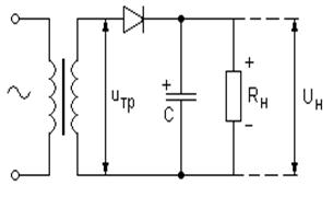 Принцип работы простейшей выпрямительной схемы следующий: при поступлении на вход схемы переменного напряжения Uвх через диод течет ток, а следовательно он течет и через Rн. На выходе мы имеем положительную полуволну тока. Течет ток и через C, заряжая эту емкость. Когда поступает отрицательная полуволна, тока через диод нет. Нет ничего и на выходе, а С разряжается через Rн, таким образом в нагрузке протекает постоянный ток с небольшими пульсациями.