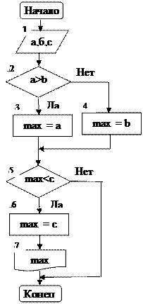 Пример ветвящегося алгоритма: найти наибольшее значение трех переменных a, b и c. Блок-схема решения этого алгоритма приведена на рис. 6.