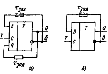 Реализация данного режима работы с использование простейшего элемента памяти требует подачи на последний для каждого последующего переключения инверсных значений входных сигналов. Такой режим обеспечивается введением в RS- или D-триггер цепей дополнительной обратной связи (рис. 5).