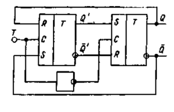 Это выражение характеризует работу асинхронного T-триггера. Используя (5) и замечания, сделанные при рассмотрении синхронного RS-триггера, можно легко получить выражение для синхронного T-триггера: