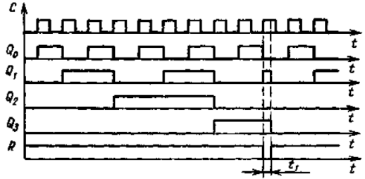 На входы дополнительного логического элемента 4И-НЕ необходимо подать комбинацию выходных сигналов разрядных схем, соответствующую двоичному коду числа 10 (1010), т.е. Q3