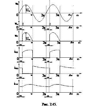 Интервал a£u<p. При u=a на управляющий электрод тиристора с СИФУ подается управляющий импульс, тиристор открывается, а напряжение на обмотке возбуждения ud возрастает скачком от нуля до значения u2 (a). После снятия управляющего импульса тиристор удерживается в открытом состоянии, т.к. ток анода оказывается больше тока выключения. Под действием напряжения u2 диод VD закрывается и не оказывает влияния на работу схемы.