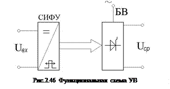 При p£u напряжение u2, прикладываемое к обмотке возбуждени Интервал p<u£2p+a. На данном интервале тиристор VS закрыт, а диод VD удерживается в открытом состоянии. Напряжение ud (u ) на обмотке возбуждения LM равно прямому падению напряжения uVD на диоде VD, т.е. практически равно нулю. Напряжение uVS (u ) на аноде тиристора равно напряжению u2 (u) на вторичной обмотке трансформатора Т. Ток iVS (u) через закрытый тиристор VS равен нулю, а ток iLM (u) обмотки возбуждения LM под действием энергии, накопленной ее индуктивностью на интервале a£u£p, протекает через диод и уменьшается по экспоненциальной зависимости. На последующих интервалах 2p+a£u£3p, 4p+a£u£5p и т.д. работа управляемого выпрямителя совпадает с описанной ранее работой на интервале a£u£p, а на интервалах 3p£u£4p+a, 5p£u£6p+a и т.д. - с работой на интервале p£u£2p+a. Как видно из рис. 2.45, напряжение ud (u) на обмотке возбуждения LM имеет вид однополярных почти прямоугольных импульсов, частота которых равна частоте питающей сети. Величина напряжения ud (u ) при открытом тиристоре VS равна напряжению u2 (u) на вторичной обмотке трансформатора и равна нулю при закрытом тиристоре. Среднее за период (2p) значение напряжения Ud (постоянная составляющая напряжения) на обмотке возбуждения LM пропорционально площади, ограниченной кривой напряжения и осью абцисс, и, следовательно, зависит от угла регулирования a. Например, U ср(a) максимально при a=0 и равно нулю при a=p. Таким образом, изменение напряжения Uвх на входе СИФУ приводит к изменению угла регулирования a и, следовательно, к изменению среднего за период напряжения Uср на обмотке возбуждения LM. Из рассмотренного не сложно заметить, что с точки зрения функционального назначения в управляемом выпрямителе можно выделить два блока (рис. 2.46): СИФУ и блок вентилей (БВ). В рассмотренных схемах БВ состоит из одного тиристора, в более сложных схемах тиристоров несколько. На функциональной схеме СИФУ показывают в виде прямоугольника. На вход СИФУ поступает напряжение Uвх постоянного тока, что условно показано в верхней части блока. Выходной сигнал СИФУ представляет собой последовательность управляющих импульсов. Причем эти импульсы сдвигаются по фазе в зависимости от Uвх (это условно показано в нижней части блока СИФУ). Для БВ входным сигналом являются импульсы СИФУ, а в качестве выходного сигнала в системах электропривода рассматривают среднее значение выпрямленного напряжения Uср.