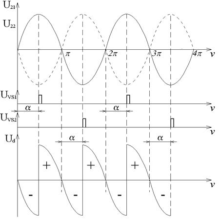 схеме используется трансформатор Т со средней точкой. Вторичные обмотки трансформатора Т включены так, что их напряжения U21, U22 сдвинуты на 180° (находится в противофазе). На управляющие электроды тиристоров VS1, VS2 подаются импульсы, сдвинутые друг относительно друга на 180°. На рис. 2.48 показаны диаграммы, соответствующие работе схемы на обмотку возбуждения (рис. 2.47 а) с углом a=30°. На первой диаграмме показаны напряжения U21, U22; на второй – управляющие импульсы; на третьей – напряжение на нагрузке. Работа схемы во многом аналогична предыдущей, поэтому опишем ее более кратко. На интервале 0< v <a ток в обмотке возбуждения поддерживается, как и в предыдущей схеме за счет энергии, накопленной в индуктивности на предыдущем интервале.