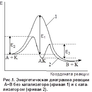 1 стадия А + К ® АК Еакт=Е2 2 стадия АК ® В + К Еакт=Е3.