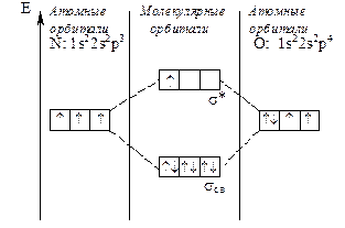 За счёт этих двух неспаренных валентных электронов, молекула О2 – парамагнитна. p = (6-2)/2 = 2. Пример 6. Рассмотрим образование молекулы NO.
