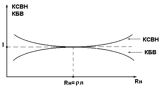 Из формул видно, если Rн л то значение Umin® Umax, и при идеальных условиях Rн= rл; Umax=Umin КБВ=1 и КСВН=1. Изменение КБВ и КСВН в волноводе в зависимости от степени согласования с нагрузкой выражается графиком: