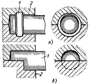 1 - стержень; 2 – форма. а - кольцевой, предотвращающий перемещение стержня в осевом направлении; б - с одним срезом, предотвращающий вращение стержня и перемещение в осевом направлении;
