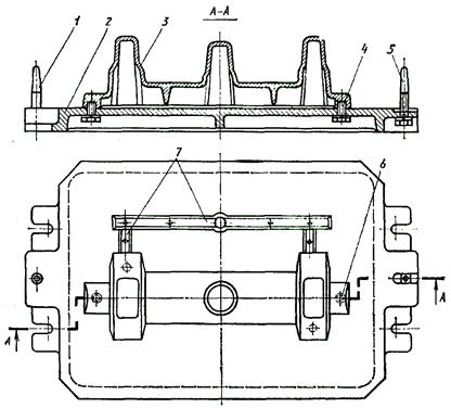 1 — штырь центрирующий; 2 — модельная плита; 3 — верхняя половина модели; 4 — крепежный болт; 5 — штырь направляющий; 6 — контрольный штифт; 7 - модели литниковой системы Рисунок – Расположение моделей отливки и литниковой системы на модельной плите