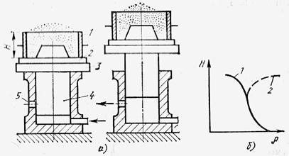 На столе 3 машины укреплена плита 2 с моделью, на которую устанавливают опоку 1 и заполняют ее формовочной смесью. Стол поднимается под давлением воздуха на 30—80 мм. После того как поршень 4 дойдет до отверстия 5, сжатый воздух выйдет, и стол, падая, ударится о преграду. Уплотнение происходит под действием силы тяжести смеси. Число ударов стола о преграду — борта пневматического цилиндра — составляет 30—50 в минуту. При встряхивании наиболее сильно уплотняются нижние слои, непосредственно прилегающие к модельной плите. По мере удаления от плиты масса вышележащего слоя смеси уменьшается, а следовательно, уменьшается степень уплотнения. Верхний слой смеси остается практически неуплотненным. Характер плотности смеси по высоте опоки при встряхивании описан кривой 1. Верхние слои смеси в опоках дополнительно уплотняют подпрессовкой. С этой целью на машинах устанавливают специальные устройства. Характер распределения плотности смеси по высоте опоки после встряхивания и подпрессовки описывается кривой 2.