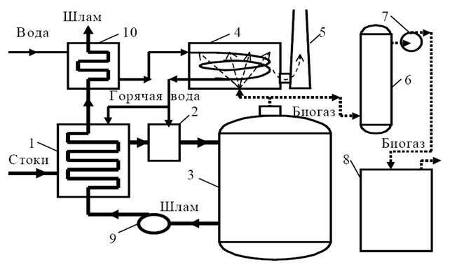 На рисунке 26 приведена схема установки для получения биогаза. Органические стоки, обычно жидкий навоз, поступают в приемник-теплообменник 1, где подогреваются нагретым шламом, подаваемым по трубе-теплообменнику насосом 9 из метантенка 3, и разбавляются горячей водой. Дополнительное разбавление стоков горячей водой и подогрев до нужной температуры проводится в аппарате 2. Сюда же для создания нужного соотношения С/N подаются отходы полеводства. Биогаз, образующийся в метантенке 3, частично сжигается в нагревателе воды 4, и продукты горения выводятся через трубу 5. Остальная часть биогаза проходит через устройство очистки 6, сжимается компрессором 7 и поступает в газгольдер 8. Шлам из аппарата 1 поступает в теплообменник 10, где дополнительно охлаждаясь подогревает холодную воду. Шлам представляет собой обеззараженное высокоэффективное естественное удобрение, способное заменить 3–4 т минерального удобрения типа нитрофоски. Кондиционирование осадков – это изменение структуры и формы связи воды в осадке, благодаря чему он полнее обезвоживается. Для ускорения процесса применяют коагуляцию растворами хлорного железа, извести, путем смешения различных видов осадков, что составляет до 40% затрат на обработку осадков. Более экономичны безреагентные методы: нагревание до 80–90°С, замораживание с оттаиванием, электрокоагуляция. Обезвоживание проводят на иловых площадках и механическим способом – на фильтрах разной конструкции и центрифугах. Широко применяются вакуум-фильтры. Термическая обработка осадков – это их сушка топочными газами, перегретым паром, горячим воздухом. Наиболее часто используются дымовые газы с температурой 500–800°С.