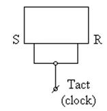 В D-триггере имеется один информационный вход и 1 вход синхронизации (разрешения, стробирования). Одновременная подача на вход S и R противоположных по знаку сигнала, за счет внутреннего инвертирования сигнала D, с помощбю элемента НЕ.