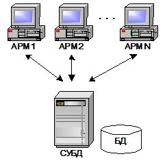 5. Клиент-серверная многоуровневая распределенная обработка данных: трехуровневая клиент-серверная архитектура при наличии в сети нескольких серверов приложений и/или серверов БД. Каждый сервер приложений, как правило, обслуживает потребности какой-либо одной функциональной подсистемы и располагается в головном для подсистемы структурном подразделе-нии, например, сервер приложения по управлению сбытом – в отделе сбыта, сервер приложения по управлению снабжением – в отделе закупок и т.д. Традиционный способ организации КИС масштаба предприятия – двухзвенная или трехзвенная архитектура клиент-сервер. Первоначально системы такого уровня базировались на классической двухуровневой клиент-серверной архитектуре (Two-tier architecture) (рис. 13).