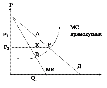 В порівнянні з конкурентною галуззю монополія, яка максимізуючи прибуток, намагається виробити менший обсяг продукції, та встановити більш високу ціну на свій товар. Збитки від монополії зазнаються як збитки для суспільства. Монополіст перерозподіляє частину доходів споживачів на свою користь, яка дорівнює площі прямокутника Р1 А К Р2. чисті збитки для суспільства від монополії це площа трикутника АВF (їх називають величиною мертвого вантажу монополії, або «мертвими збитками»). Ціни монопольного ринку вище конкурентних, разом з тим ми повинні пам’ятати, що монополіст прагне до максимізації сукупного прибутку, а не прибутку на одиницю продукції.
