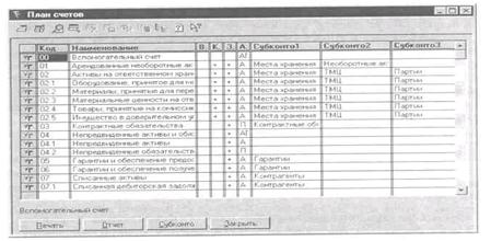 Дещо відокремленим у 1С:Бухгалтериї є план рахунків, який теж можна було б назвати довідником, якби не його виняткова важливість для організації бухгалтерського обліку. Цей план - одна з головних складових типової конфігурації. План рахунків у програмі структурно відділений від довідників. Його можна викликати командою План счетов/План рахунків з пункту Операції головного меню або клацнувши на відповідній кнопці панелі інструментів. До плану рахунків звертаються під час набирання документів, формування різноманітних звітів. Після виклику плану рахунків на екрані з'явиться його діалогове вікно, що містить перелік усіх рахунків, які використовують. Зовні план рахунків дуже подібний до довідника, однак повне налаштування і коригування плану рахунків можливе тільки з конфігуратора. Проте, введення нових рахунків і додавання субрахунків до вже наявних, можна виконувати без виклику Конфігуратора