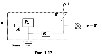 Наконец, для отрицания релейно-контактная схема реализуется с применением обратного переключателя, т.е. контакты переключателя замкнутся при А = 0 и наоборот (рис. 1.12). Используется и другое графическое изображение релейно-контактных схем. Логической переменной