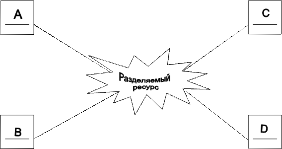 Пример: четыре компьютера разделяют общий канал связи и используют его для передачи файлов. При этом, пока A посылает файл на D, B и C должны ждать: