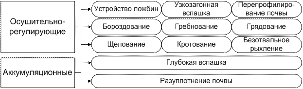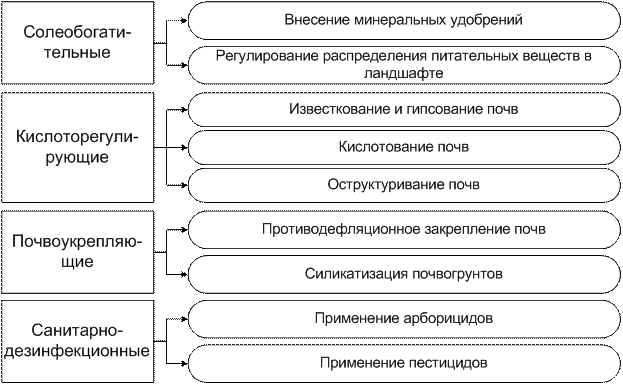 Агротехнические мероприятия заключаются восстановлении и повышении плодородия, улучшения ее структурного состояния за счет применения специальных способов обработки и посева, проведении мероприятий по задержанию и регулированию поверхностного стока, в снегозадержании и др. Земельные мелиорации (рис.12.3) направлены коренное изменение свойств почв от изменения гранулометрического состава и вплоть до создания почвенного покрова.