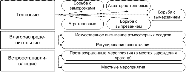 На плоских водоразделах и пологих склонах, на крутых склонах, по берегам рек, вдоль лощин, балок и оврагов формируют поле–и почвозащитные лесные полосы. Предотвращают развитие эрозионных процессов лесные насаждения на песках и песчаных почвах, на склонах, гребнистых водоразделах. Агролесомелиорации проводят вокруг животноводческих ферм и в местах отдыха скота, вдоль дорог и в населённых пунктах. Эффективны растительные мелиорации в комплексе с культуртехническими, агротехническими, гидротехническими и др. мероприятиями. Например, при борьбе с водной эрозией они сочетаются с противоэрозионной обработкой почвы, травосеянием, террасированием, устройством валов, лотков и водосливов, запруд; при борьбе с ветровой эрозией – с почвозащитными севооборотами и специальной агротехникой. Комплексные мероприятия по регулированию климата в нужном человеку направлении называется климатическими мелиорациями (рис.12.5). Проводится на сравнительно небольших территориях и преимущественно в приземном слое атмосферы.