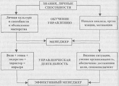 Имеется ряд характеристик личности менеджера, которые создают ему целостность характера, устойчивость, формируют потенциал, силу личности. Из всех профессиональных и личностных характеристик складывается профессиональная модель менеджера (рис.), состоящая как бы из двух взаимодействующих и взаимопроникающих частей, которые формируются и в сфере обучения, и в сфере деятельности. Эти качества создают эффективного менеджера, деятельность которого подчиняется его культуре самоменеджмента, включающей: непрерывное самоопределение и самооценку, выявление недостаточно развитых способностей, навыков управления, поиск способов их развить, нахождение ресурсов времени и средств для обучения, тренинга этих навыков. Однако без личностного напряжения, без воли, терпения, труда, обуздания отрицательных черт характера самоменеджмент невозможен.