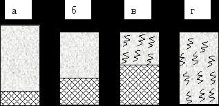 Рис 1. Последовательные стадии (а – г) растворения ВМС в низкомолекулярной жидкости На начальной стадии (рис.1а) система состоит из двух компонентов: полимера и низкомолекулярной жидкости. Переход а→б характеризуется интенсивным проникновением молекул низкомолекулярной жидкости в структуру полимера и сольватацией полимерной цепи, сопровождающийся выделением теплоты (ΔН<0). Изменение энтропии по сравнению с энтальпийным фактором незначительно. При этом объем полимера возрастает, но общий объем системы полимер-растворитель уменьшается. Это явление называется контракцией, а выделение теплоты говорит о физико-химической природе процесса. Переход б→в представляет собой начальный этап распределения макромолекул полимера по всему объему растворителя и характеризуется возрастанием энтропии системы вследствие роста числа возможных конформаций. Энтальпия системы если и изменяется, то незначительно. На данном этапе происходит обычно основное увеличение объема и массы полимера. Это результат дальнейшего проникновения молекул растворителя в полимерную сетку, ее разрыхление и связанное с этим частичное освобождение макромолекул. Отдельные макромолекулы начинают отрываться друг от друга и переходить в слой низкомолекулярной жидкости. Ограниченное набухание заканчивается на стадии б или в образованием студня. Дальнейшее развитие процесса – неограниченное набухание – приводит к растворению полимера, т. е. образованию раствора ВМС (рис.1г). Переход в→г происходит в результате сил диффузии и характеризуется значительным увеличением энтропии системы. При этом макромолекулы ВМС равномерно распределяются по всему объему низкомолекулярного растворителя, образуя истинный раствор. Так как растворение полимеров главным образом обусловлено ростом энтропии, то и устойчивость растворов ВМС объясняется в основном энтропийным фактором. Набухание и, следовательно, растворение ВМС зависят от природы растворителя и полимера, строения макромолекул полимера, температуры, присутствия электролитов, а также от рН среды (для полиэлектролитов).