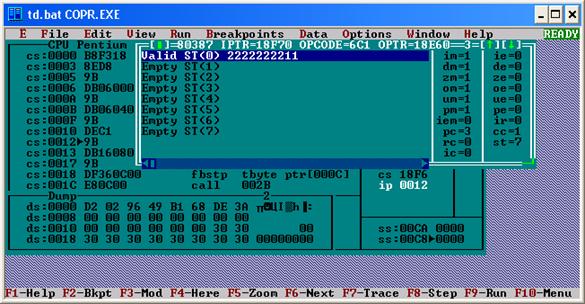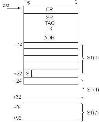 Рис. 9. Область памяти для выполнения команд FSAVE/FNSAVE dst FRSTOR src – осуществляет загрузку регистров МСП данными из 94-байтной области памяти, определенной адресом src. За командой FRSTOR может следовать любая команда процессора, но для команды МСП надо поставить команду WAIT. FNOP – не выполняет никаких действий. Исходный текст программы, используемой для выполнения лабораторной работы ![]()