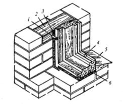 Рис. 62. Крепление оконных блоков в проемах каменных стен (переплеты и подоконная доска не показаны): 1 – ерш-костыль; 2 – антисептированный вкладыш; 3 – пакля; 4 – прорезь для отвода конденсата; 5 – наружный водослив из оцинкованной стали; 6 – оконная коробка