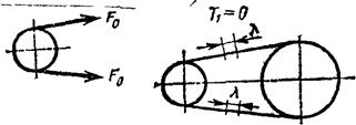 Усилия и напряжения в ветвях ремня. Критерии работоспособности Начальное натяжение ремня Fo выбирают по условию, при котором ремень мог бы передавать полезную нагрузку, сохраняя натяжение достаточно длительное время, не получая большой вытяжки, и имел бы удовлетворительную долговечность. До передачи вращения ветви испытывают одинаковое начальное натяжение Fo. Напряжение от предварительного натяжения равно s0=1,8 МПа для плоских ремней и s0=1,2 МПа - для клиновых. Рассмотрим передачу полезной нагрузки Ft