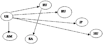 3) Сетевые информационные модели. Сетевые информационные модели применяются для отражения таких систем, в которых связь между элементами имеет сложную структуру. например, различные части глобальной компьютерной сети Интернет (Америка, Европа, Россия и т.д.) связаны между собой высокоскоростными линиями связи.