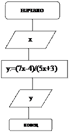 Этап 1. Математическое описание решения задачи. Оно представлено в условии задачи. Этап 2. Определение входных и выходных данных. Следуя математическому описанию, входным данным является аргумент функции х, выходным данным (результатом вычислений) – значение функции у. Этап 3. разработка алгоритма решения.