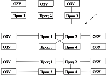 Существуют и другие подходы к классификации архитектур. Например, классификация Базу, описывающая систему на основе тех решений, которые были приняты на стадии ее проектирования, классификация Кришна марфи и др. рассмотрим в качестве примеров некоторые конкретные типы архитектур вычислительных систем. Ассиметричная мультипроцессорная обработка (ASMP). В этой архитектуре каждый процессор суперкомпьютера имеет свою оперативную память. В ASMP три схемы, но в любом случае процессоры связаны между собой, образуя как бы скоростную локальную сеть. Эта связь может осуществляться через общую шину, либо непосредственно между процессорами, либо опосредованно через другие процессоры. Непосредственные связи используются при небольшом числе процессоров. Каждый процессор имеет свою память. Благодаря этому, если это необходимо, процессоры могут располагаться в различных, но рядом установленных корпусах. Совокупность устройств в одном корпусе называется кластером. Пользователь, обращаясь к кластеру, может работать сразу с группой процессоров. Такое объединение увеличивает скорость обработки данных и расширяет используемую оперативную память. Повышается также надежность системы из-за того, что кластеры осуществляют дублированные данных.