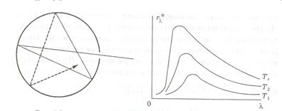 Рис. 1. Рис.2. Если внутреннюю стенку такой полости покрыть сажей, то излучение, проникшее внутрь через маленькое отверстие, после многократных отражений полностью поглощается. Это не означает, что из такой полости ничего не выходит. Если стенки полости поддерживать при некоторой температуре Т, то из отверстия будет выходить излучение, весьма близкое по спектральному составу к излучению АЧТ той же температуры. Разлагая это излучение каким-либо способом в спектр и измеряя I (интенсивности) его различных участков, можно экспериментально найти вид функции для разных температур. На рис. 2 приведены результаты этих опытов. Разные кривые относятся к различным значениям температуры АЧТ (Т 3 > T 2 > T 1). Площадь под любой кривой равна энергетической светимости АЧТ при соответствующей Т. Из этого рисунка следует: 1) энергетическая светимость rω АЧТ сильно растет с температурой (закон Стефана – Больцмана) и, во – вторых, максимум спектральной плотности излучения с ростом Т сдвигается в сторону более коротких длин волн (закон смещения Вина). Рассмотрим эвакуированную полость, стенки которой поддерживаются при постоянной температуре Т. В равновесном состоянии энергия излучения распределяется в объеме полости с некоторой объемной плотностью W (T) (Дж/м3). Спектральное распределение этой энергии можно охарактеризовать функцией w (w, T) (Дж·с/м3), определяемой условием, аналогичным (1.1):