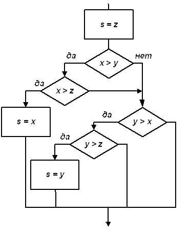 а) с использованием полной альтернативы: ЕСЛИ (x > y) If (x > y) ТО ЕСЛИ (x > z) Then If (x > z) ТО s = x Then s:=x ИНАЧЕ s = z Else s:=z ИНАЧЕ ЕСЛИ (y > z) Else If (y > z) ТО s = y Then s:=y ИНАЧЕ s = z; Else s:=z; Внимание! В этом вложенном операторе точка с запятой только одна – в конце всего оператора. б) с использованием усеченной альтернативы: вариант 1